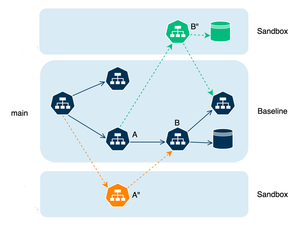 The core idea is that, with each request between services, we need to intelligently decide if the request should go to the baseline service or to the sandbox. This solution is generally referred to as request-level isolation of testing/development services.