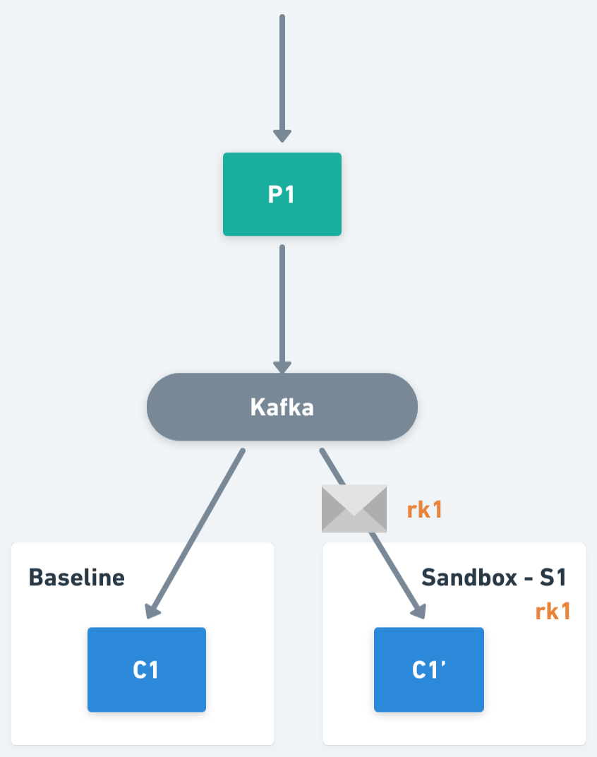 On the other hand, if we think from the perspective of a baseline workload, it should only process the traffic without routing keys, or with routing keys not matching the keys assigned to any of its sandboxed workloads. Extending the example, imagine that now we also have Sandbox S2, with routing key rk3 that forks consumer C1, generating C1". C1' will be responsible for routing keys rk1 and rk2. C1" will be responsible for routing key rk3. And C1 (the baseline) will process all the other traffic (i.e. traffic not matching with routing keys rk1, rk2 or rk3).