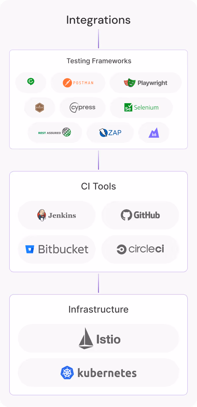 Run integration, API, end-to-end, and performance tests with parallel execution on Kubernetes.