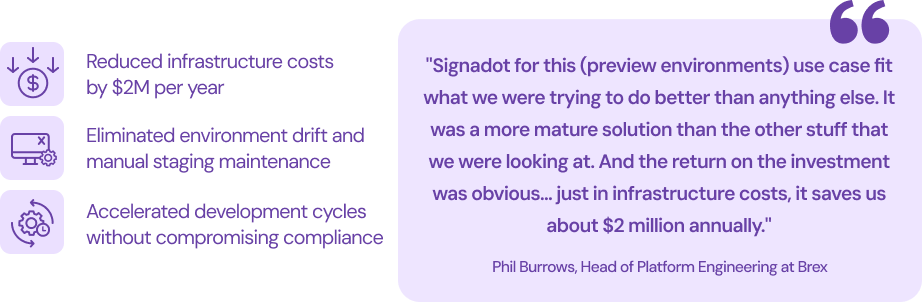Brex adopted sandbox testing via Signadot to support hundreds of developers while maintaining complianceand real API fidelity. They: